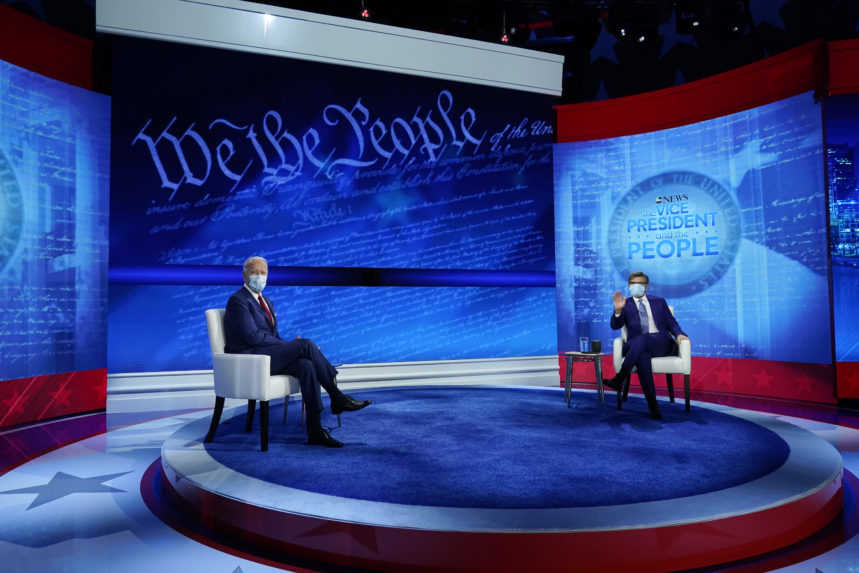 Na snímke vľavo demokratický prezidentský kandidát Joe Biden počas televíznej diskusie pre stanicu ABC vo Philadelphii v noci na 16. októbra 2020. TASR/AP/Carolyn KasterFoto: TASR/AP/Carolyn Kaster