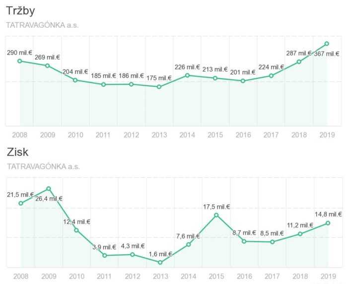 Na snímke zisk a tržby spoločnosti Tatravagónka od roku 2008 do roku 2019.Foto: finstat.sk