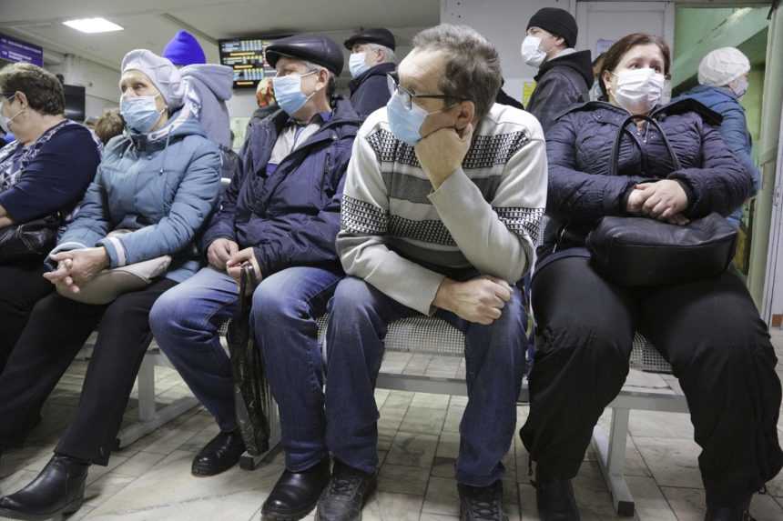 Na snímke ľudia s ochrannými rúškami čakajú v ambulancii nemocnice na ošetrenie v sibírskom meste Omsk v Rusku.Foto: TASR/AP