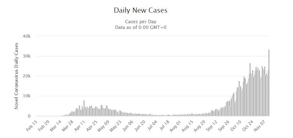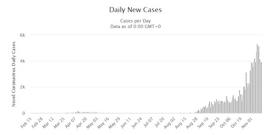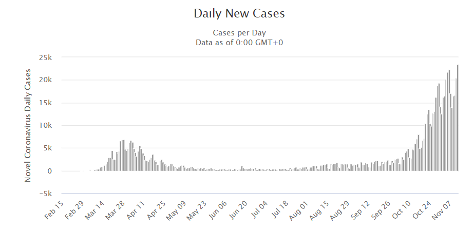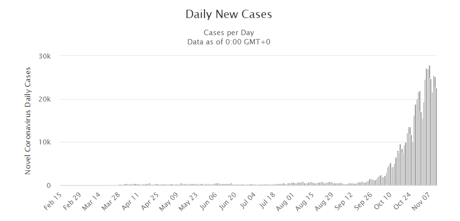 Doterajší rekord 23 399 novoinfikovaných bol hlásený minulú sobotu (7. 11.). Do piatka pribudlo aj 218 nových súvisiacich úmrtí a ich doterajší celkový počet tak stúpol na 12 200. Celkovo evidujú v krajine 751 095 pozitívne testovaných a 481 700 už vyliečených ľudí.