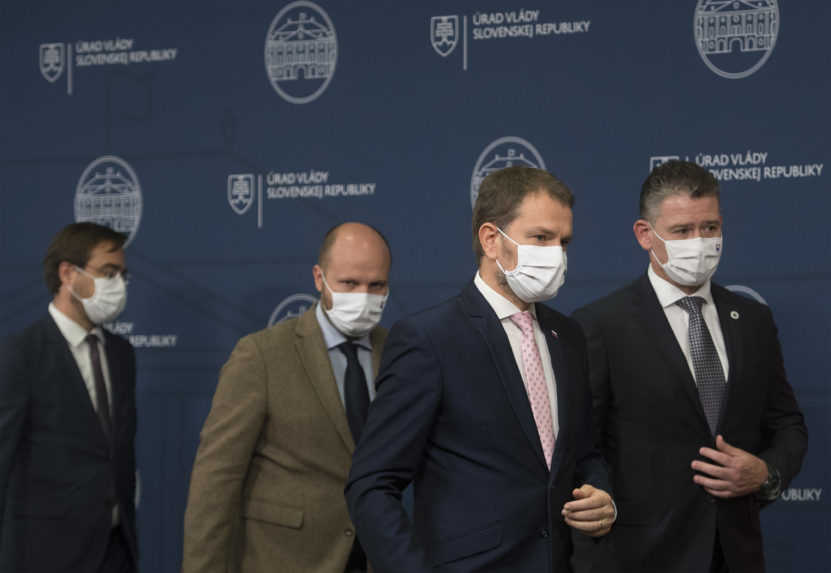 Na snímke zľava minister zdravotníctva SR Marek Krajčí, minister obrany Jaroslav Naď, premiér SR Igor Matovič a minister vnútra Roman Mikulec (všetci OĽANO).Foto: TASR