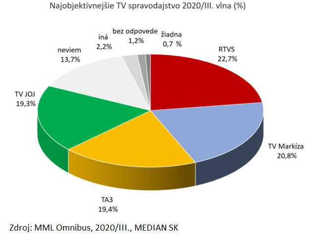 Televízne spravodajstvo RTVS je naďalej najobjektívnejšie na Slovensku. Vyplýva to z aktuálneho prieskumu agentúry Median SK za obdobie júl až september 2020. Zúčastnilo sa na ňom 2 061 respondentov vo veku 14 až 79 rokov. Spravodajstvo verejnoprávnej televízie za najobjektívnejšie označilo 22,7 % opýtaných. RTVS si tak aj v 3. kvartáli tohto roka udržala rovnako ako v 2. kvartáli 2020 prvú pozíciu.