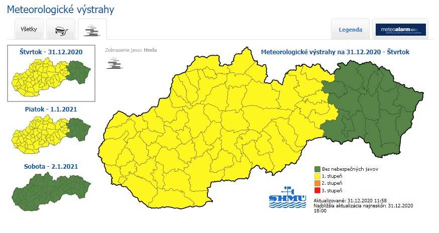 Na väčšine územia Slovenska treba počítať vo štvrtok 31. decembra a v piatok (1. 1.) s hmlou s dohľadnosťou 50 až 200 metrov. Upozorňuje na to Slovenský hydrometeorologický ústav (SHMÚ), ktorý vydal výstrahy prvého stupňa. Informuje o tom na webovej stránke.