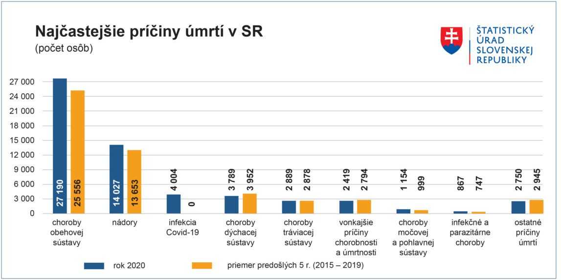 Najčastejšou príčinou smrti na Slovensku boli v minulom roku choroby obehovej sústavy. Na ich následky zomrelo vyše 27 000 ľudí. Druhou najčastejšou príčinou úmrtí boli nádory. Vlani na ne zomrelo približne 14 000 ľudí. Treťou častou príčinou bol koronavírus, ktorý zároveň najviac prepisoval štatistiky úmrtí. Vyplýva to z dát o príčinách smrti na Slovensku v roku 2020, ktoré v piatok (26. 3.) zverejnil Štatistický úrad (ŠÚ) SR.