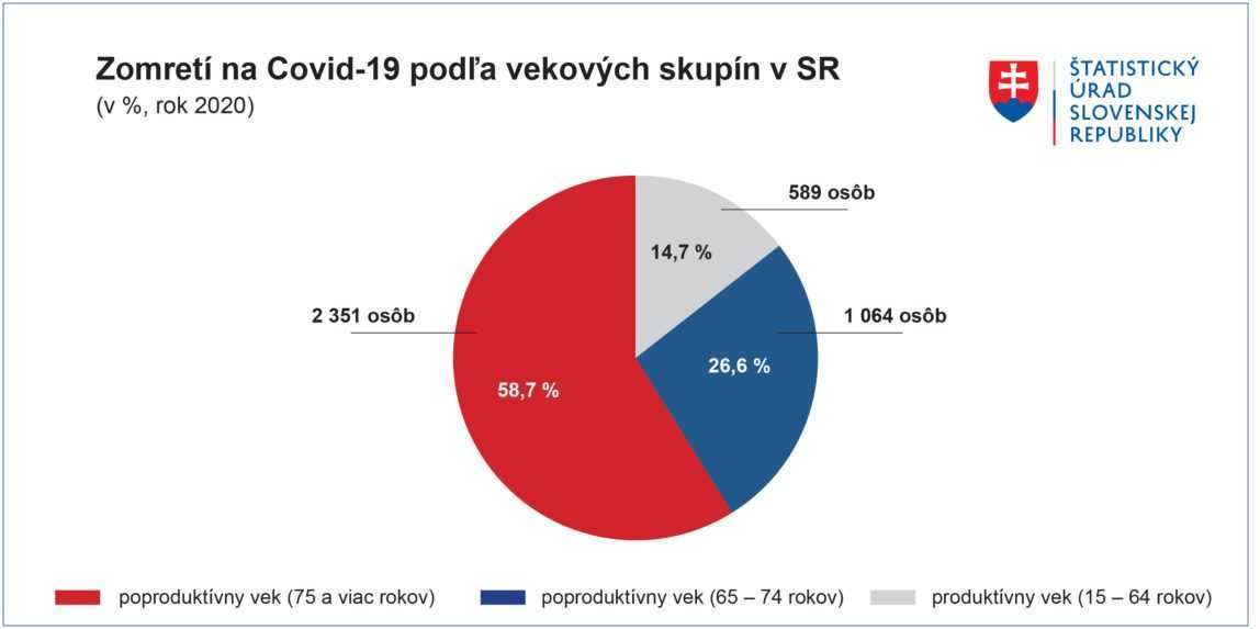 „Koronavírus sa stal masívnou príčinou úmrtí až v rámci druhej vlny pandémie. Viac ako 97 % úmrtí, ktoré sa pripisujú ochoreniu COVID-19 ako hlavnej príčine, sa udialo v poslednom štvrťroku 2020,“ povedala riaditeľka odboru štatistiky obyvateľstva štatistického úradu Zuzana Podmanická. Z hľadiska vekovej štruktúry väčšina obetí ochorenia COVID-19 patrila do seniorskej vekovej kategórie nad 65 rokov. Tvorili 85 % z počtu zomretých.