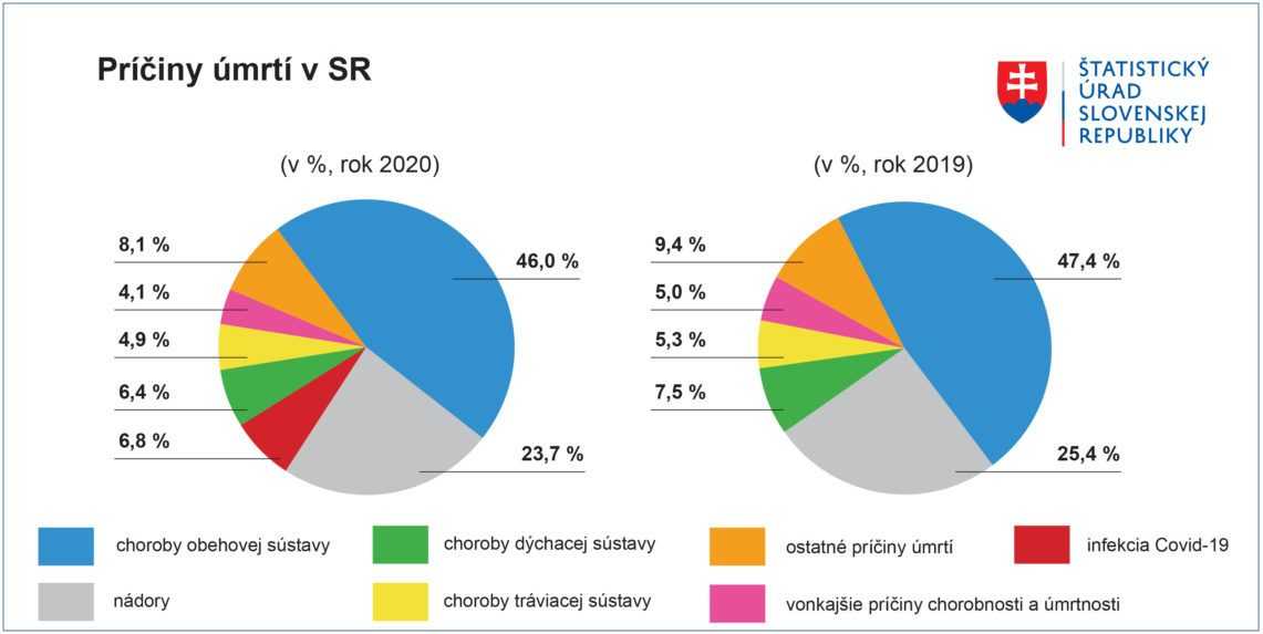 Dlhodobo najčastejšou príčinou s výrazne najvyšším podielom na zomieraní v krajine sú choroby obehovej sústavy, tvoria až vyše 40 % príčin úmrtí na Slovensku. Minulý rok dosahovali tieto diagnózy podiel na všetkých úmrtiach 46 %.