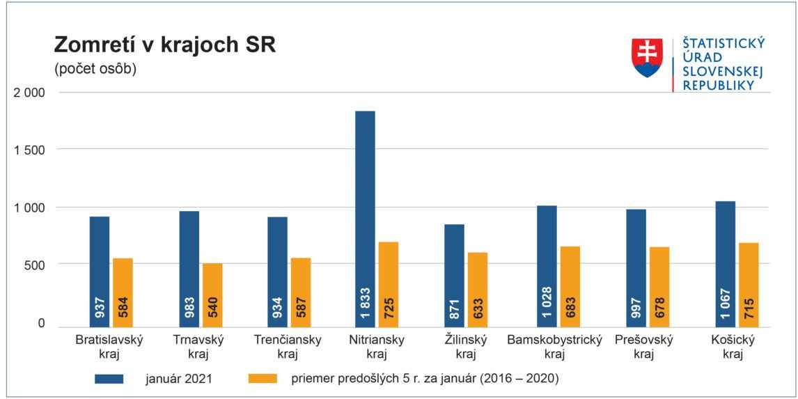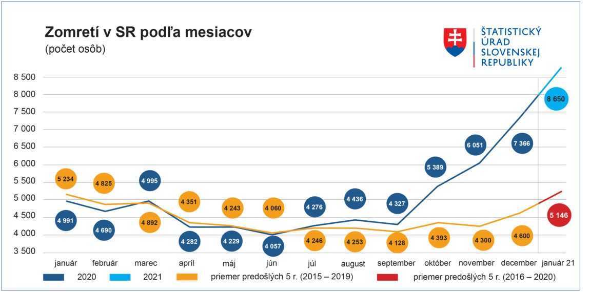 Predbežné dáta potvrdzujú, že v januári 2021 sa vytvoril nový smutný mesačný rekord Slovenska v zomieraní. „Celkové počty zomretých sú sledovanou štatistikou aj preto, aby bolo možné získať údaje o nadúmrtnosti v porovnaní s  predošlými rokmi bez ohľadu na príčinu smrti. Následne vzniká priestor pre sofistikovanejšie analýzy o celkovom vplyve takej vážnej situácie, akú zažívame posledný rok na spoločnosť,“ spresnila Zuzana Podmanická, riaditeľka odboru štatistiky obyvateľstva ŠÚ.
