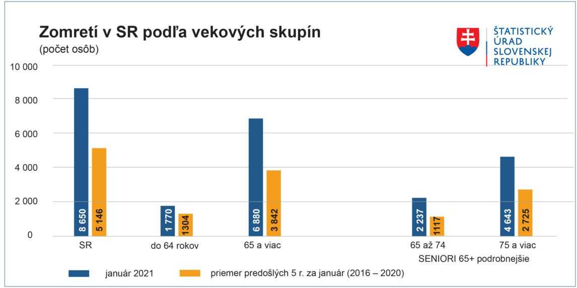 V skupine 65-ročných a starších seniorov sa výrazne vyššia úmrtnosť prejavuje už od októbra minulého roka. V januári 2021 až osem z desiatich úmrtí tvorili osoby práve tejto vekovej kategórie obyvateľov. Spolu zomrelo počas prvého mesiaca roka takmer 6,9 tisíca seniorov, čo bol oproti predošlým rokom nárast o 79 %. To predstavuje o 3 000 osôb viac ako predošlé roky.