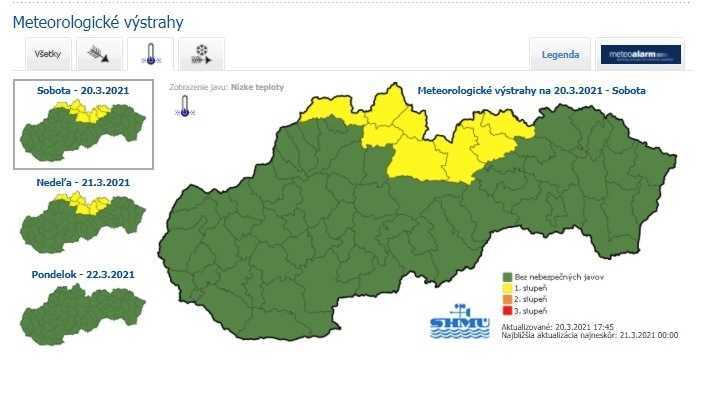 Na Orave, Kysuciach, Liptove, Spiši i Zamagurí môže teplota v noci a počas nedeľňajšieho (21. 3.) rána klesnúť ojedinele až na -16 stupňov Celzia. Výstrahu pred mrazom v severných prihraničných okresoch vydal Slovenský hydrometeorologický ústav (SHMÚ).