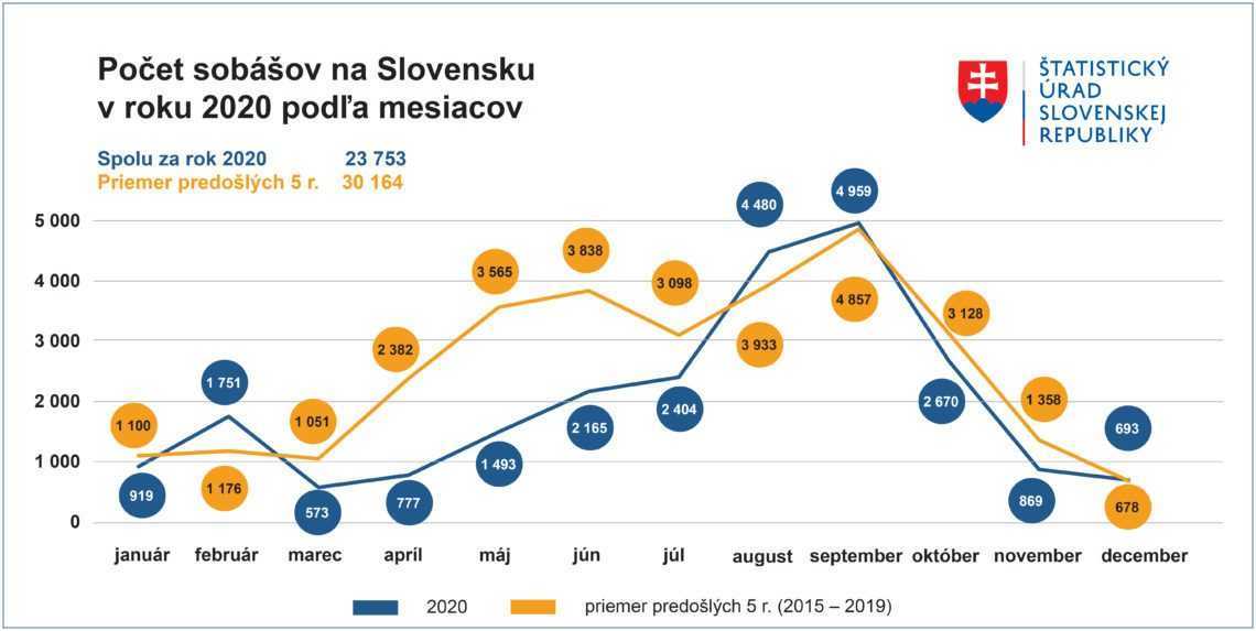 Najmenej svadieb bolo práve v marci, keď sa na Slovensku uzatvorilo iba 573 manželstiev (2 % všetkých vlaňajších sobášov). Naopak, najviac svadieb, takmer 5 000, bolo už tradične v septembri a prekvapil aj február, počas ktorého bolo uzavretých neobvykle veľa sobášov. Celkovo do manželstva v roku 2020 vstúpilo takmer 23 800 párov.
