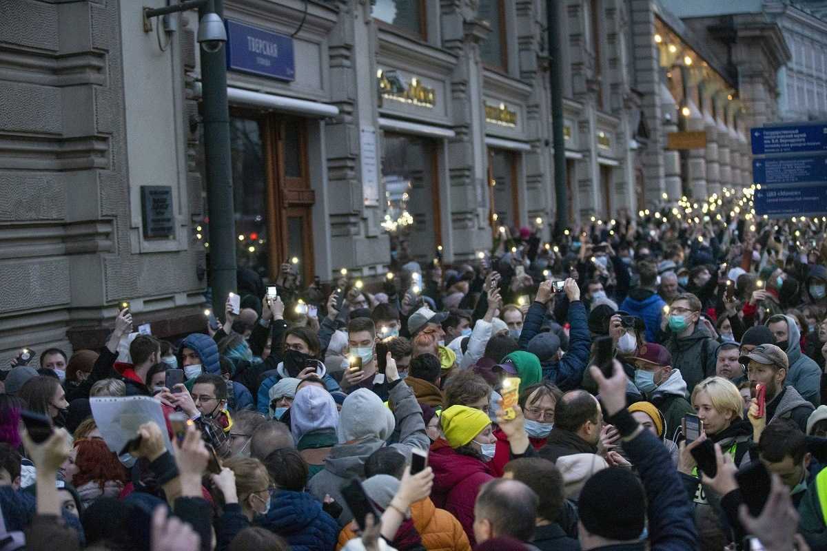 Na snímke atmosféra na protestoch v Moskve 21. apríla 2021.