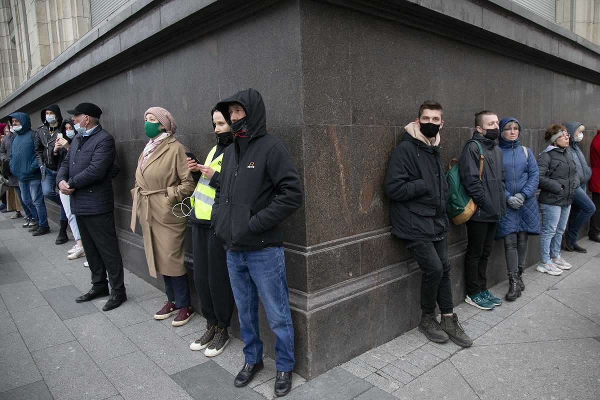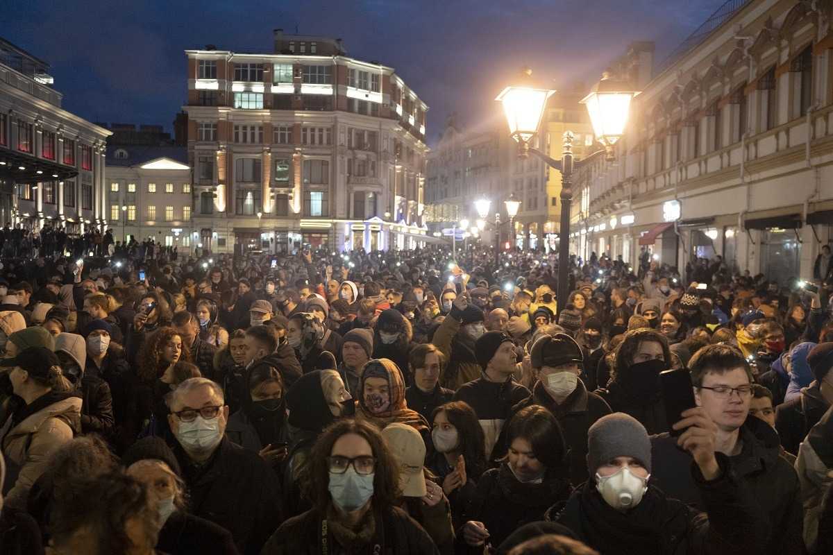 Na snímke atmosféra na protestoch v Petrohrade 21. apríla 2021.