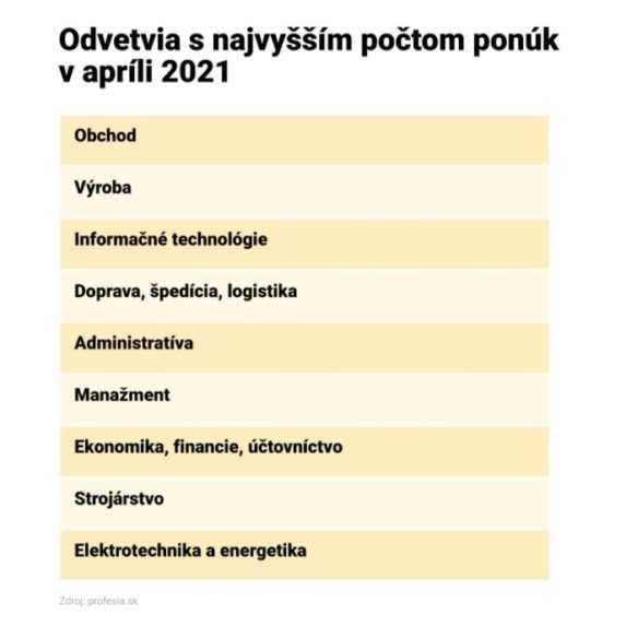 Kým prvý štvrťrok uverejnili firmy najviac pracovných ponúk v IT, v apríli bolo najviac inzerátov v obchode a vo výrobe. Uvoľnenie opatrení prebralo aj odvetvie cestovný ruch, gastro a hotelierstvo. Pracovný portál zaznamenal v apríli v týchto odvetviach 933 pracovných ponúk, čo je o 320 viac ako za celý prvý štvrťrok tohto roka.