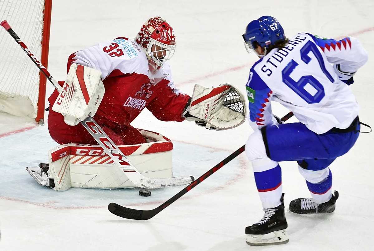 Na snímke brankár Sebastian Dahm (Dánsko) a druhý vpravo Juraj Slafkovský (Slovensko).