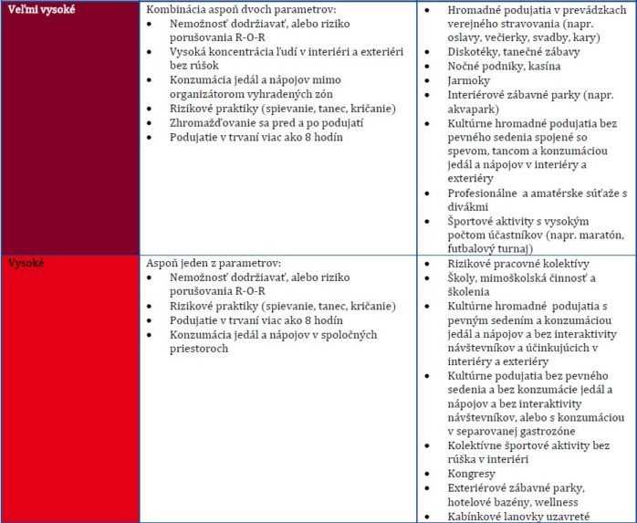 Za aktivity s veľmi vysokým rizikom považuje napríklad hromadné podujatia (napr. oslavy, svadby, večierky) v reštauráciách, diskotéky, jarmoky či kultúrne podujatia bez pevného sedenia. Veľmi vysoko rizikovými sú preto, že je na nich vysoká koncentrácia ľudí a predpoklad porušovania základnej trojice protipandemických opatrení R-O-R (Rúško-Odstup-Ruky, pozn. red.).