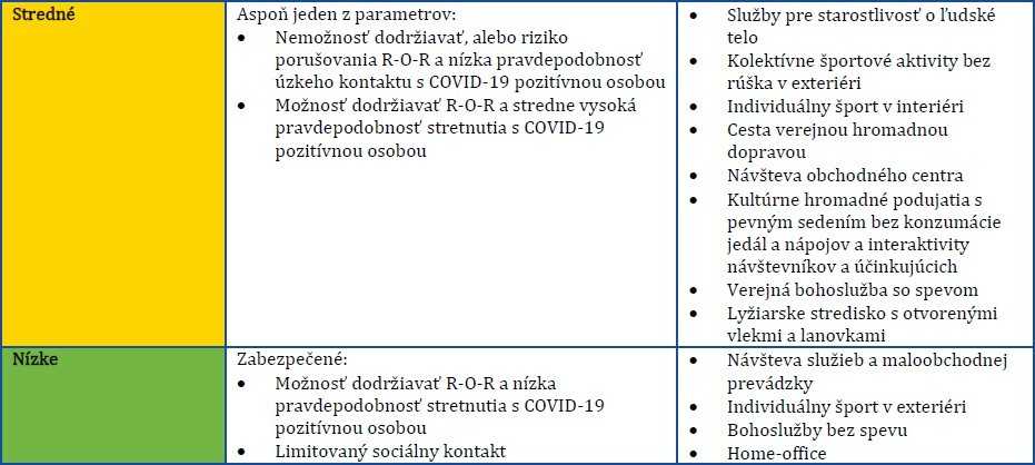 Nízko rizikovými aktivitami sú podľa dokumentu návštevy služieb a moloobchodných prevádzok, bohoslužby bez spevu, individuálny šport v exteriéri a tiež home office. Vo všetkých spomenutých prípadoch sa totiž dá dodržiavať základné pravidlo R-O-R a ide o aktivity s nízkym sociálnym kontaktom.