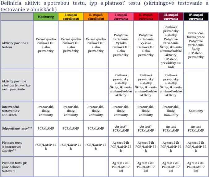 Antigénové testy budú mať podľa nového automatu hlavnú úlohu v čase rastu pandémie, keď je „predpokladaná vysoká vírusová nálož v populácii“ a pri náraste sedemdňovej incidencie nad 100 infikovaných na 100 000 obyvateľov. V súvislosti s testovaním nový automat obsahuje aj tabuľku, ktorá definuje aktivity s potrebou testu aj typ a platnosť testu.