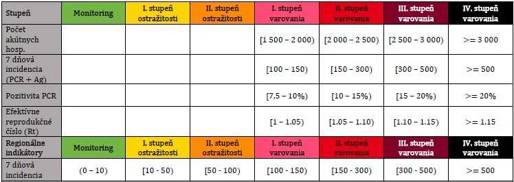 Aj podľa nového automatu budú platiť celonárodné a regionálne stupne varovania, respektíve ostražitosti, zmenia sa len niektoré kritériá na ich určenie. Z kľúčových ukazovateľov vypadol priemerný počet nových prípadov za 7 dní, nahradila ho sedemdňová pozitivita PCR testov a sedemdňová incidencia z PCR a antigénových testov (počet prípadov za 7 dní na 100 000 obyvateľov).