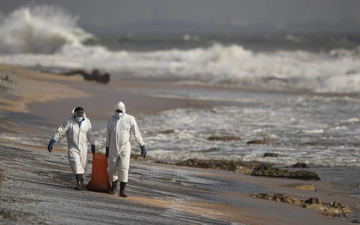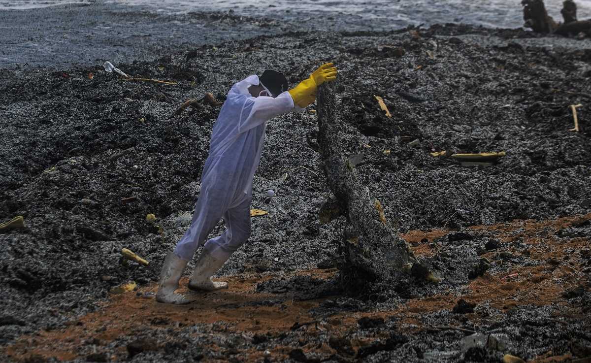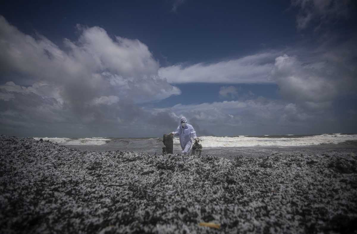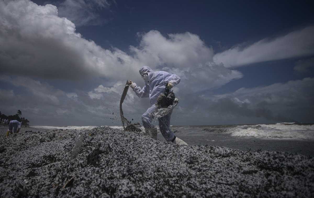 Príslušník vojenského námorníctva čistí pláž od odpadu, ktorý vyplavilo z horiacej lode.