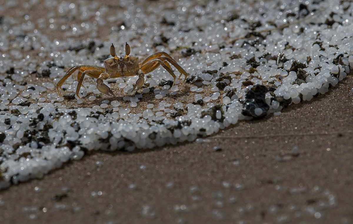 Krab prechádza plážou posiatou drobnými plastovými granulami, ktoré prevážala kontajnerová loď.