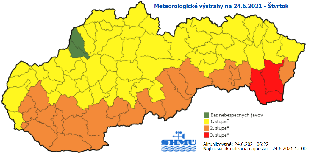 Pre Banskobystrický, Trenčiansky, Košický, Prešovský a Žilinský kraj platí výstraha prvého stupňa pred búrkami, a to už od rána. S búrkami môžu byť spojené krátkodobé, ale intenzívne lejaky, pri ktorých môžu úhrny dosiahnuť 20 až 40 milimetrov a nárazy vetra rýchlosť 65 až 85 kilometrov za hodinu.