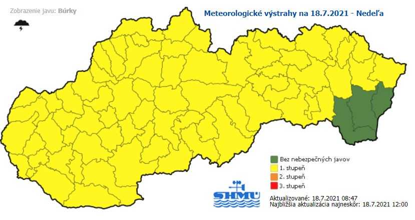 Aj počas nedele (18. 7.) sa môžu na takmer celom území Slovenska vyskytnúť búrky s krúpami. Upozornil na to Slovenský hydrometeorologický ústav (SHMÚ) na svojom webe.