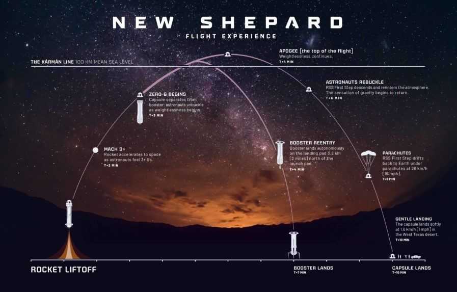Raketa má vzlietnuť o 15.00 h SELČ z kozmodrómu spoločnosti Blue Origin v púšti na západe Texasu. Podľa plánu sa od nej po necelých troch minútach odpúta modul s posádkou a sám vystúpi nad Kármánovu hranicu vo výške 100 kilometrov, ktorá je všeobecne uznávanou hranicou medzi zemskou atmosférou a vesmírnym priestorom.