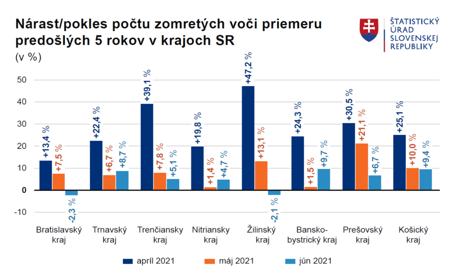 Nadúmrtnosť sa počas šiesteho mesiaca tohto roka prejavila v šiestich z ôsmich slovenských krajov, pričom v jednotlivých regiónoch dosahovala 5 až 10 %.