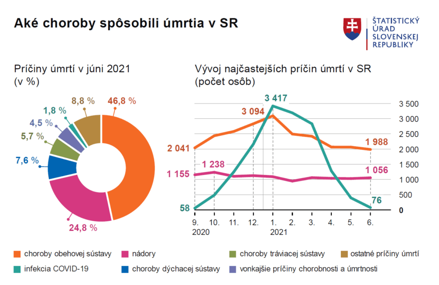 Počty zomretých sa v júni priblížili predošlým rokom. Celková nadúmrtnosť sa za tento mesiac na Slovensku znížila na 5 %, v štyroch krajoch však dosahovala vyššie hodnoty do 10 %. COVID-19 bol medzi príčinami úmrtí na ôsmej priečke, dosiaľ sa tento rok umiestňoval do tretieho miesta. Informoval o tom v stredu (28. 7.) Štatistický úrad (ŠÚ) SR.