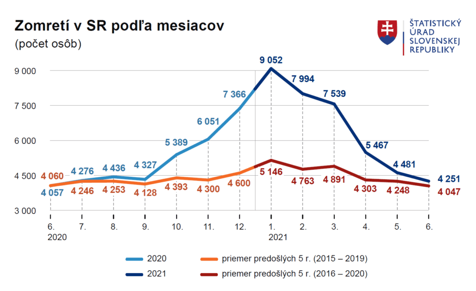 Spresnil, že v júni zomrelo na Slovensku 4 251 osôb, čo je najmenej za posledných dvanásť mesiacov. Celkový počet úmrtí prevyšoval zhruba o 5 % priemer júnových hodnôt v predchádzajúcich piatich rokoch. Ochorenie COVID-19 sa na úmrtiach podieľalo necelými 2 %.