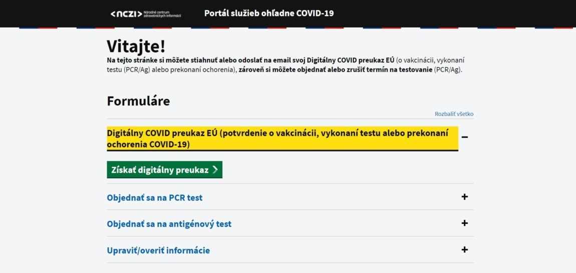 Na snímke web NCZI, na ktorom je možné požiadať o digitálny covidový preukaz.Foto: covidforms.nczisk.sk