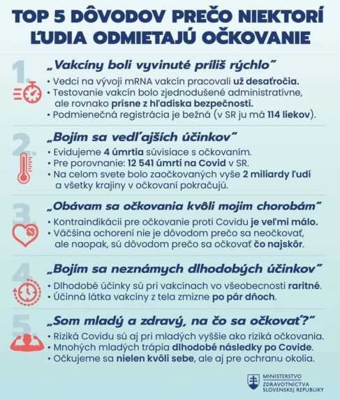 Na päť najčastejšie sa opakujúcich dôvodov, ktoré vzišli z prieskumov verejnej mienky, monitoringu a analýz sociálnych sietí, poskytol rezort zdravotníctva vysvetlenia.