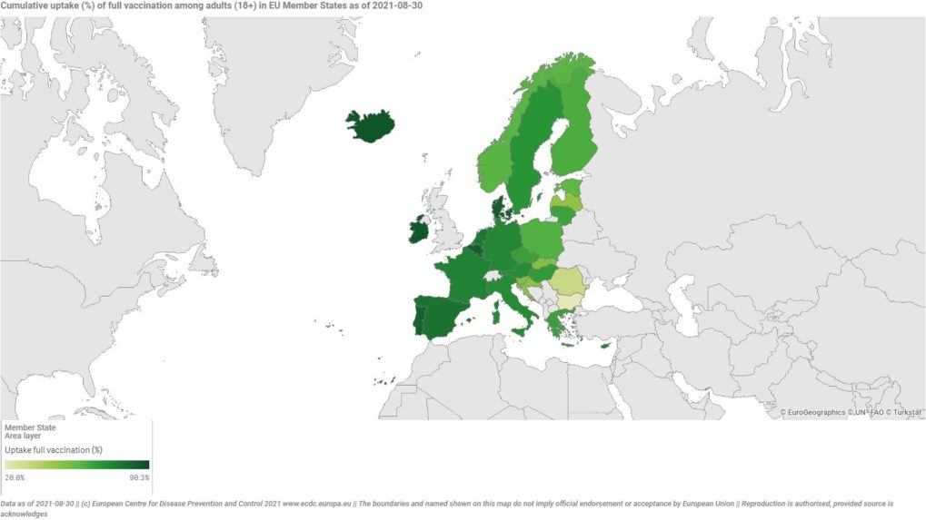 Predovšetkým vinou nedostatku vakcín v prvých mesiacoch roka EÚ výrazne zaostávala za Spojeným kráľovstvom či Spojenými štátmi. Postupne sa jej však podarilo rozdiely znížiť. Kým Británia už 70-percentnú hranicu prekročila, v USA tempo očkovania poľavilo a únia ich predstihla.