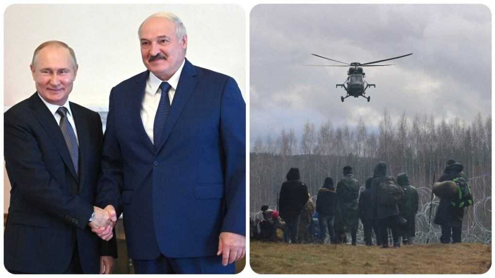 Na snímke zľava ruský prezident Vladimir Putin, hlava Bieloruska Alexandr Lukašenko a migranti na poľsko-bieloruských hraniciach.Foto: TASR/AP, koláž: RTVS