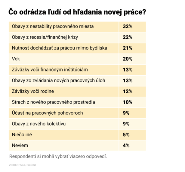 Pri uvažovaní nad zmenou zamestnania Slovákov najviac odrádzajú obavy z nestability pracovného miesta. Takúto odpoveď označila až tretina respondentov.