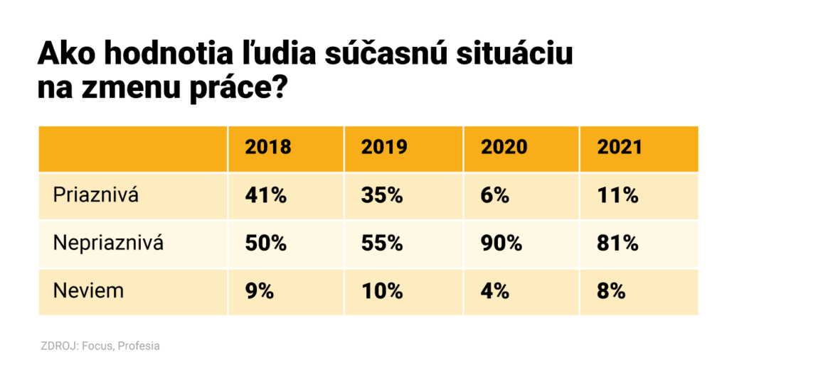 Rok 2021 vytvoril na trhu práce nové rekordy v počte pracovných ponúk, Slováci sú napriek tomu opatrní. Zišla by sa im garancia, že im nezrušia nové miesto a boja sa finančnej krízy. Vyplýva to z prieskumu agentúry Focus pre spoločnosť Profesia, ktorý sa uskutočnil od 16. do 23. novembra 2021 na vzorke 1 005 respondentov.