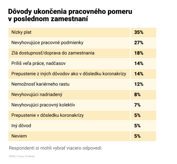 Keď už Slovák zmení prácu, najčastejšie je to pre nespokojnosť s platom, ukazuje prieskum. Takúto odpoveď uviedla vyše tretina respondentov. Tento dôvod uvádzali ľudia najčastejšie v každom jednom kraji na Slovensku.