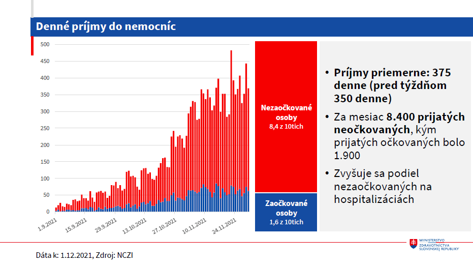 Na jednotke intenzívnej starostlivosti a oddelení anestéziológie a intenzívnej medicíny je 600 pacientov, podporu umelej pľúcnej ventilácie potrebuje 291 ľudí. „Viac ako 82 percent z nich nie je zaočkovaných, alebo má len jednu dávku očkovacej látky,“ uvádza rezort.