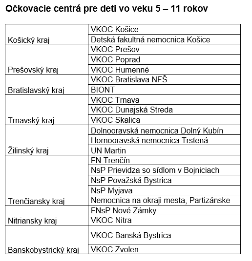 V Bratislave budú deti od 5 do 11 rokov očkovať vo veľkokapacitnom centre na Národnom futbalovom štadióne a Centre pre zobrazovaciu diagnostiku BIONT. V Trnavskom kraji sa bude očkovať vo veľkokapacitných centrách v Trnave, Dunajskej Strede a Skalici.
