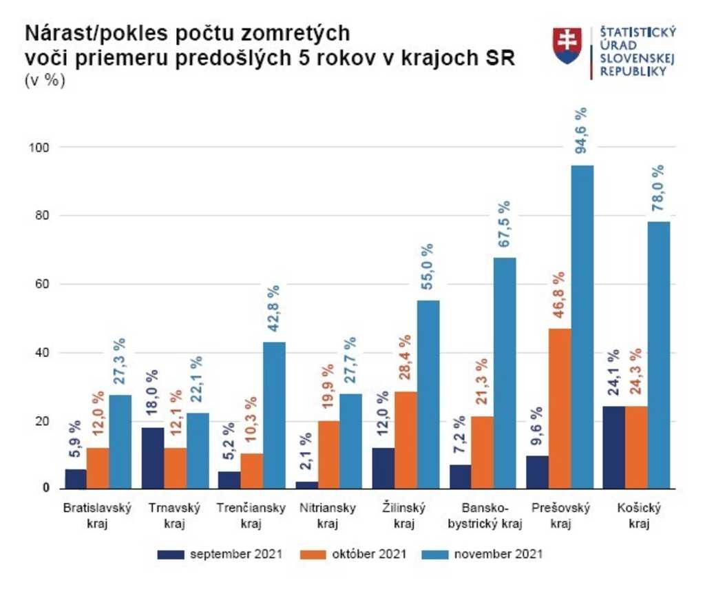 Najhoršia situácia bola v Prešovskom kraji, kde zomrelo v porovnaní s predošlými rokmi o 95 percent viac ľudí. Nasledoval Košický kraj (nadúmrtnosť 78 percent) a Banskobystrický kraj (nadúmrtnosť 68 percent). „Naopak, len malé zhoršenie situácie v porovnaní s októbrom sa prejavilo v Nitrianskom a v Trnavskom kraji, ale aj v týchto regiónoch zomrelo o štvrtinu viac ľudí ako v predošlých rokoch,“ podotkli z ŠÚ SR.