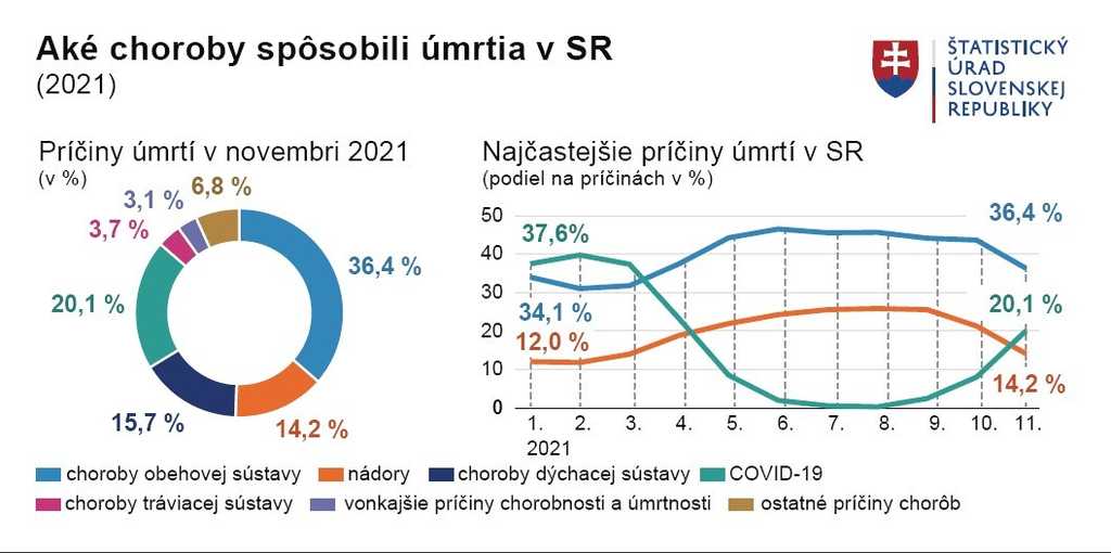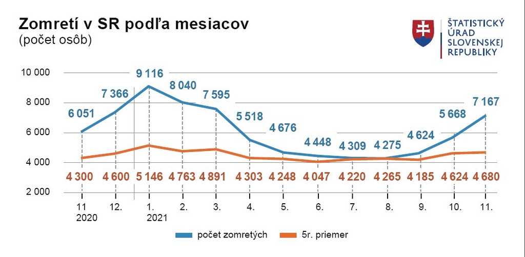 V novembri zomrelo na Slovensku 7 167 osôb. Je to takmer o 2 500 viac, ako bol novembrový priemer v predošlých rokoch. Celková nadúmrtnosť tak v predchádzajúcom mesiaci na Slovensku dosiahla 53 percent. Zvyšovalo ju aj ochorenie COVID-19, ktoré bolo druhou najčastejšou príčinou úmrtí v SR.