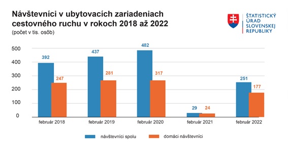 Hotely a penzióny navštívilo vo februári 2022 štvrť milióna hostí. Napriek výraznému medziročnému rastu však išlo stále len o 52 % návštevnosť oproti februáru 2020, poslednému mesiacu pred pandémiou. Uviedol to v pondelok (11. 4.) vo svojej správe Štatistický úrad (ŠÚ) SR.