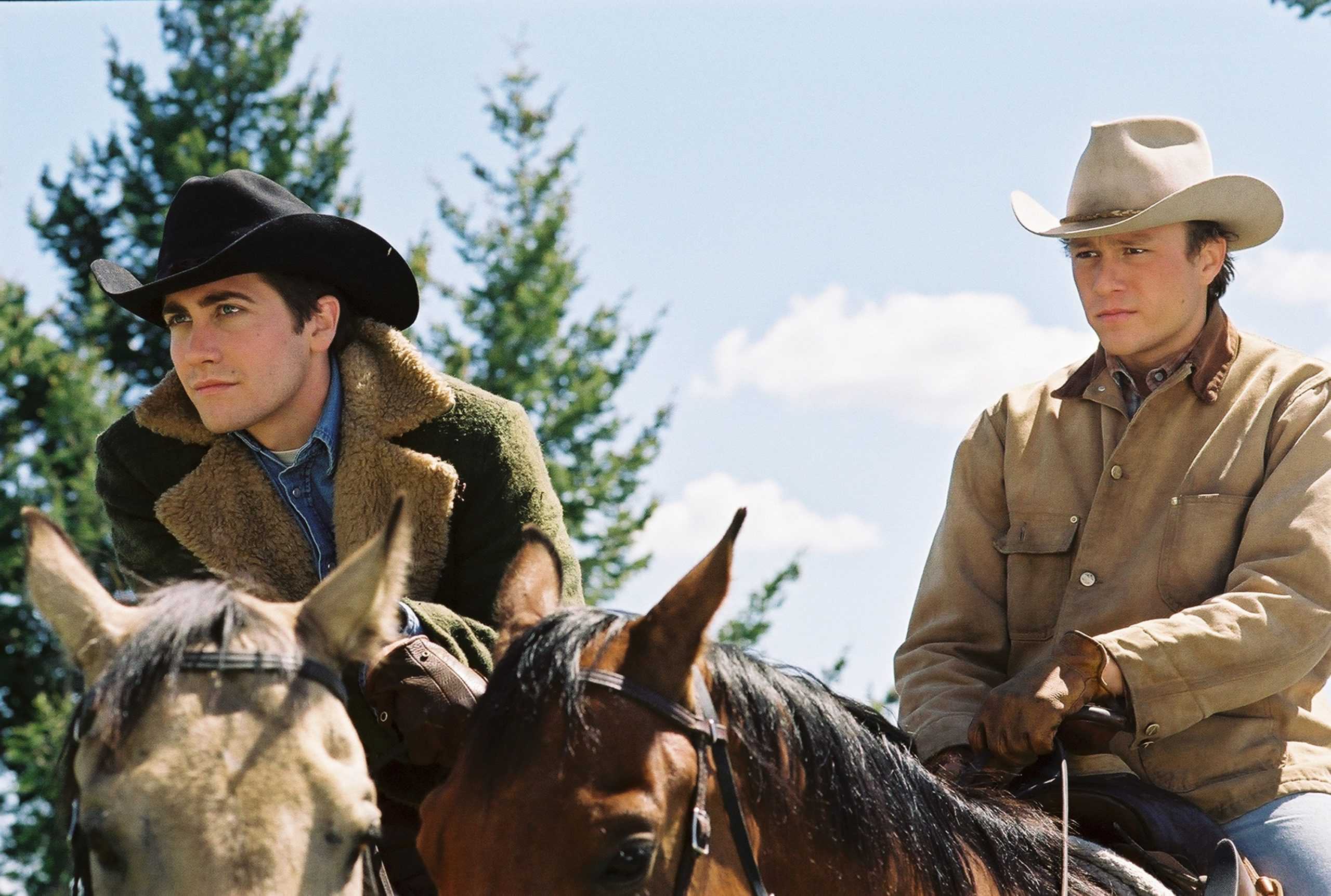 Jake Gyllenhaal (vľavo) a Heath Ledger na koňoch počas natáčania filmu Skrotená hora.