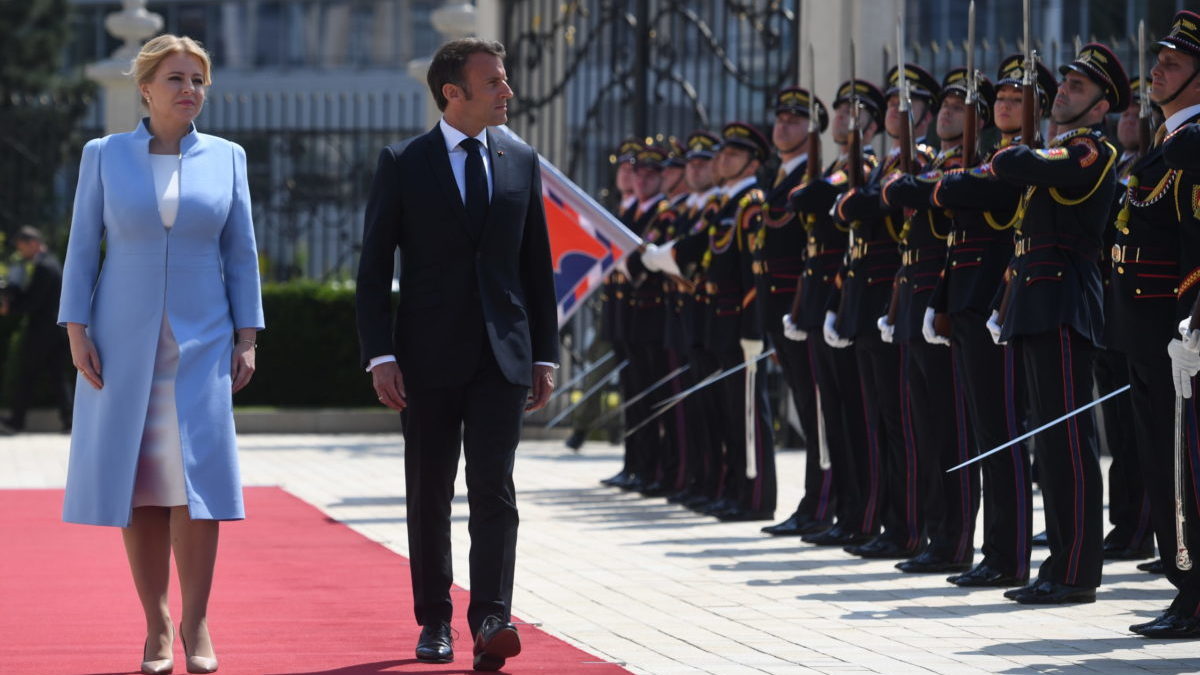 Prezidentka Zuzana Čaputová a francúzsky prezident Emmanuel Macron si prezerajú čestnú stráž.