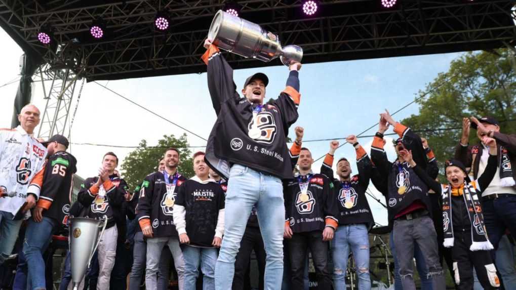 Brankár HC Košice Dominik Riečický počas slávnostného ukončenia sezóny hokejistov HC Košice a oslavy majstrovského titulu na Hlavnej ulici v Košiciach.Foto: SITA