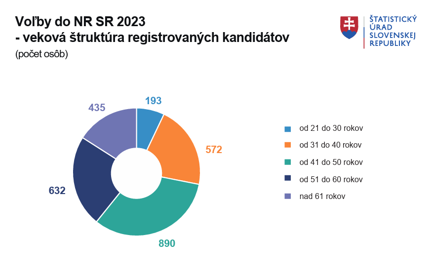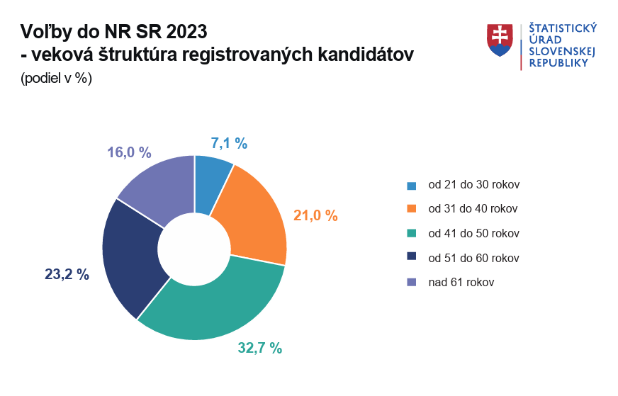 Priemerný vek kandidátov politických strán v parlamentných voľbách je v rozmedzí 41 až 58 rokov. Väčšina z kandidujúcich politických subjektov (18 z 24) má priemerný vek svojich kandidátov do 50 rokov. Informoval o tom v utorok (22. 8.) Štatistický úrad (ŠÚ) SR.