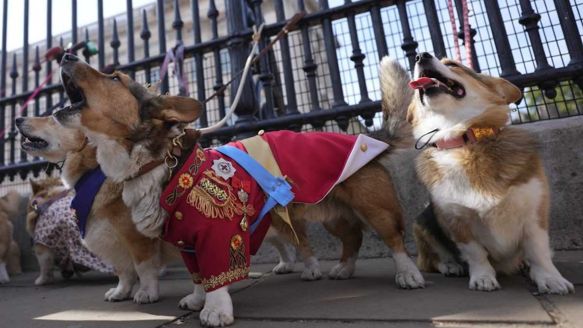 Nadšenci vyobliekali svojich psov do kráľovských šiat a prešli sa s nimi pred Buckinghamským palácom.