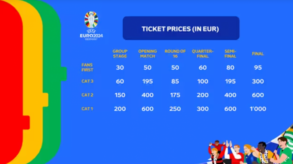 UEFA uviedla, že na stretnutia skupinovej fázy sa predá 270.000 vstupeniek v kategórii od 30 eur. Jedinou výnimkou je úvodný duel turnaja v Mníchove, na ktorý stojí najlacnejšia vstupenka 50 eur. Ceny sa na vyraďovaciu fázu následne zvýšia, pričom za finálový zápas v Berlíne bude potrebné zaplatiť minimálne 95 eur.