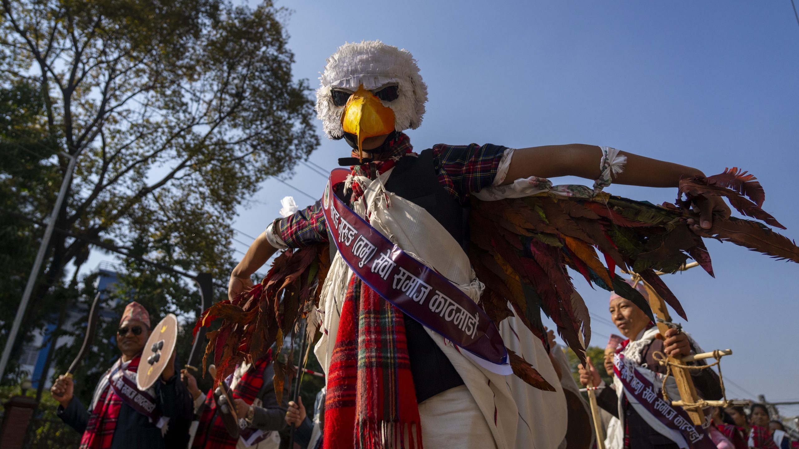 Muži z komunity Gurung tancujú na prehliadke pri príležitosti nového roka v Nepále.