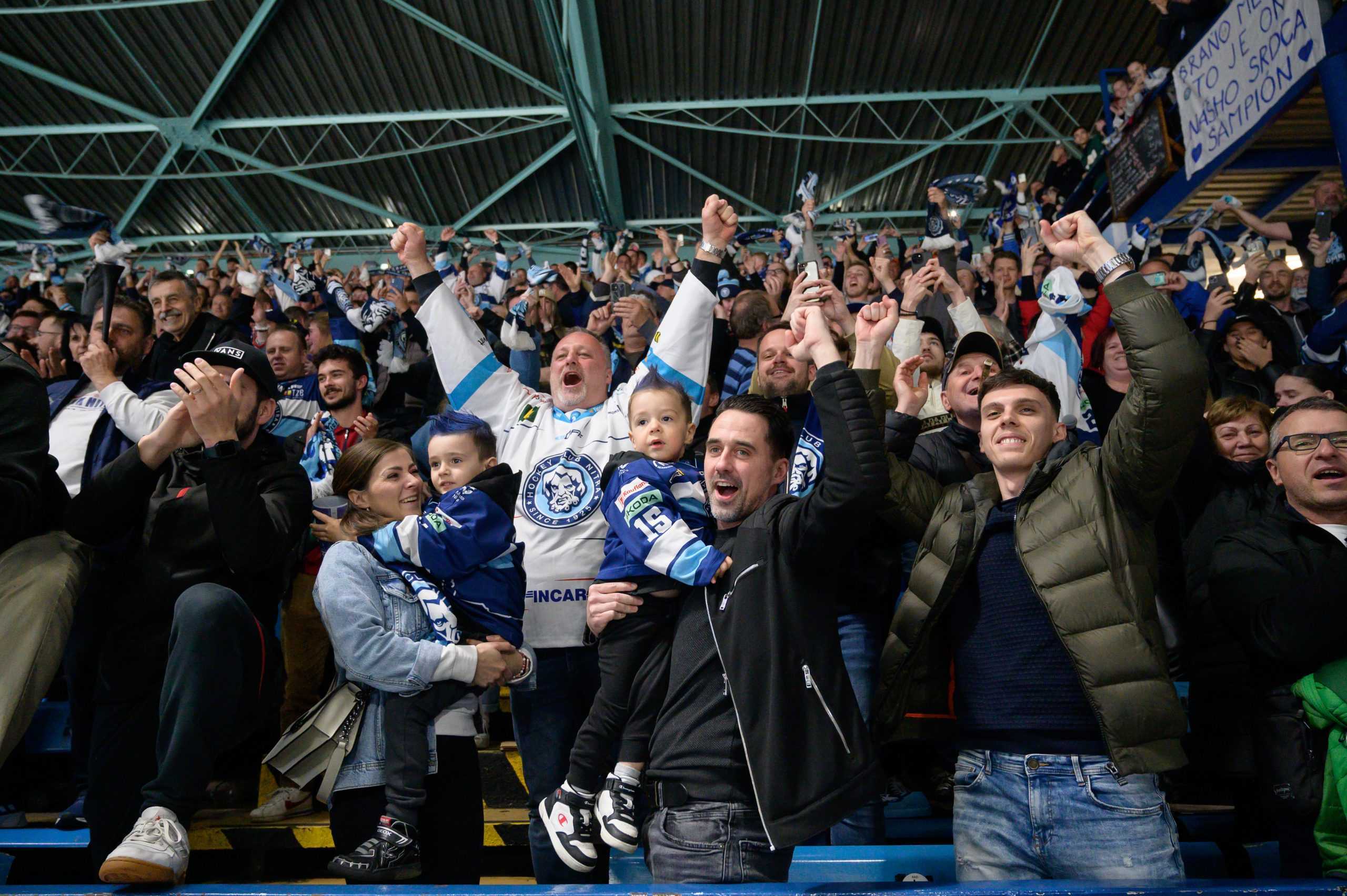 Hokejisti Nitry sa teia zo zisku majstrovského titulu po tvrtom zápase finále play off hokejovej Tipos extraligy medzi HK Nitra a HK Spiská Nová Ves v Nitre 24. apríla 2024. FOTO TASR - Henrich Mioviè *** Local Caption *** rados oslavy majstrovský titul fanúikovia diváci
